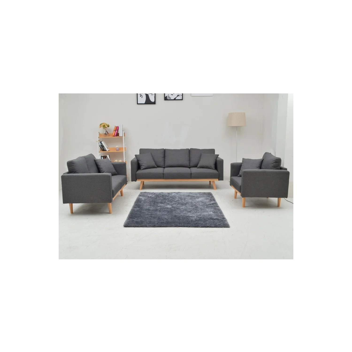 - Couleur : Gris avec pieds en bois naturel