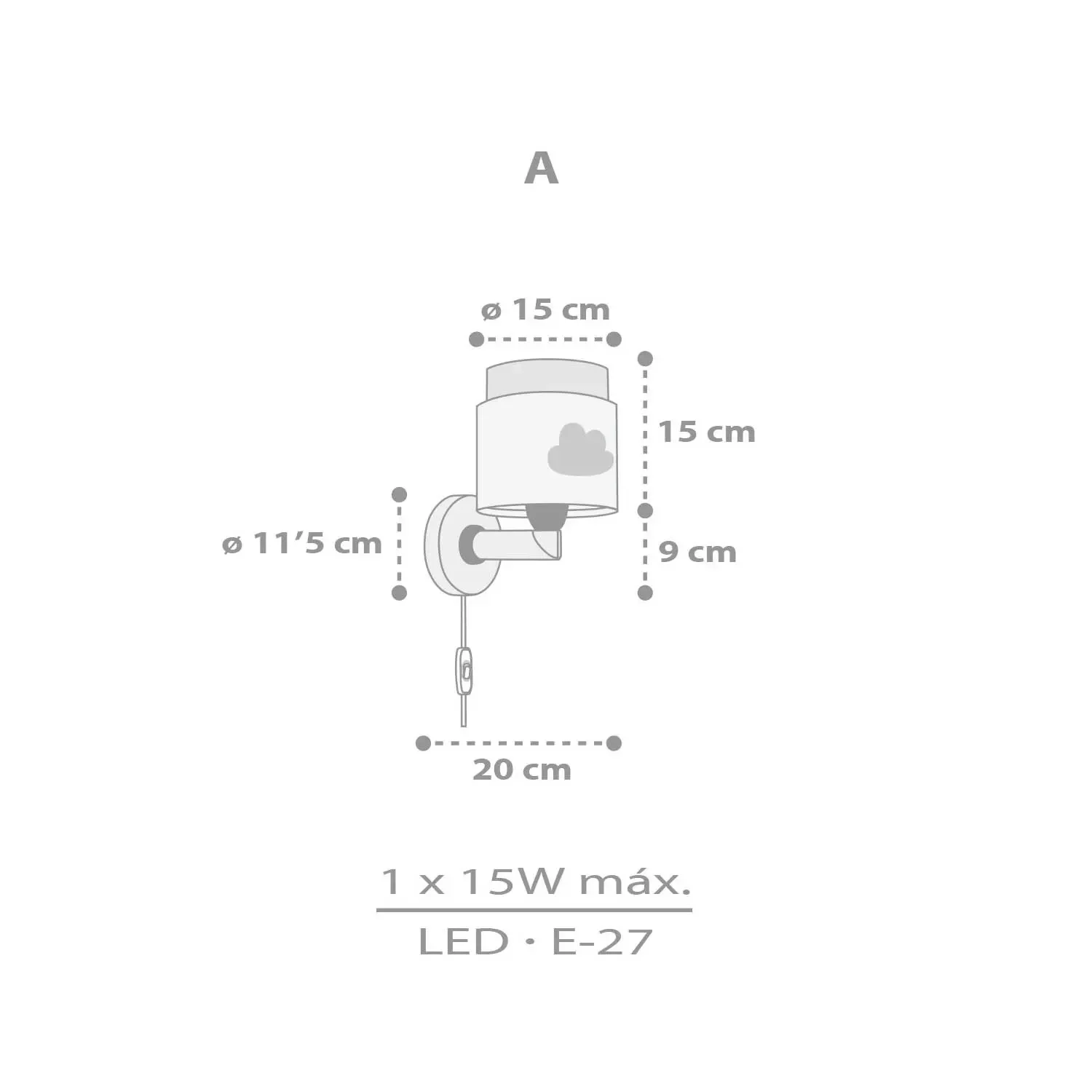 Cet applique présente un design attrayant qui comprend trois petites nuages de couleur grise, qui brillent doucement dans l'obscurité, offrant une ambiance chaleureuse pendant la nuit. Fabriqué en polypropylène, il est léger et sûr, idéal pour les chambres d'enfants. Ses dimensions sont compactes : il a une hauteur de 24 cm, un diamètre d'écran de 15 cm, une largeur de 20 cm et une base fixée au mur d'un diamètre de 11,5 cm.