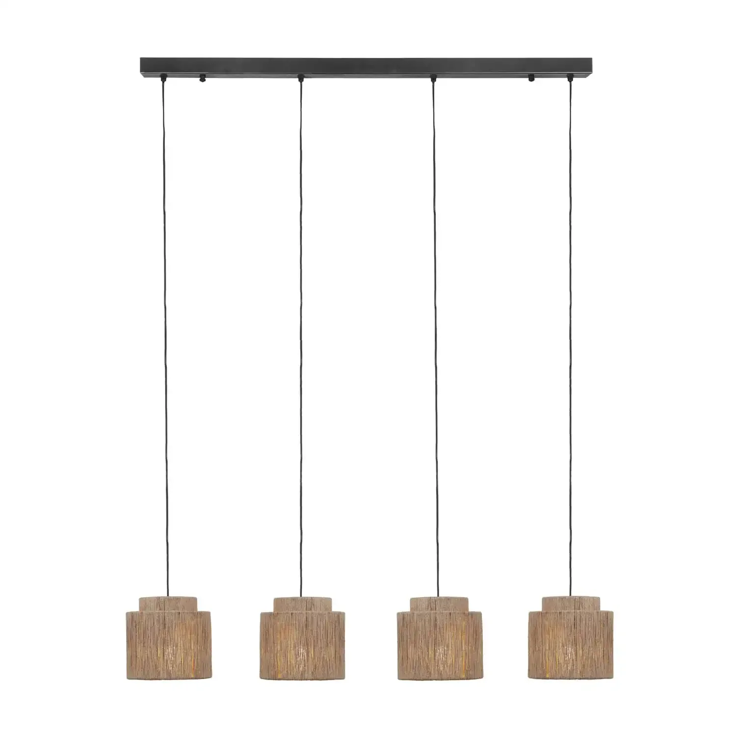 La Suspension à 4 lumières Leiko Jute Naturel E27 associe design moderne et matériaux naturels pour apporter chaleur et style à tout espace. Ses abat-jour en jute tressé diffusent une lumière douce et accueillante, tandis que la structure en métal noir mat crée un contraste élégant et contemporain.