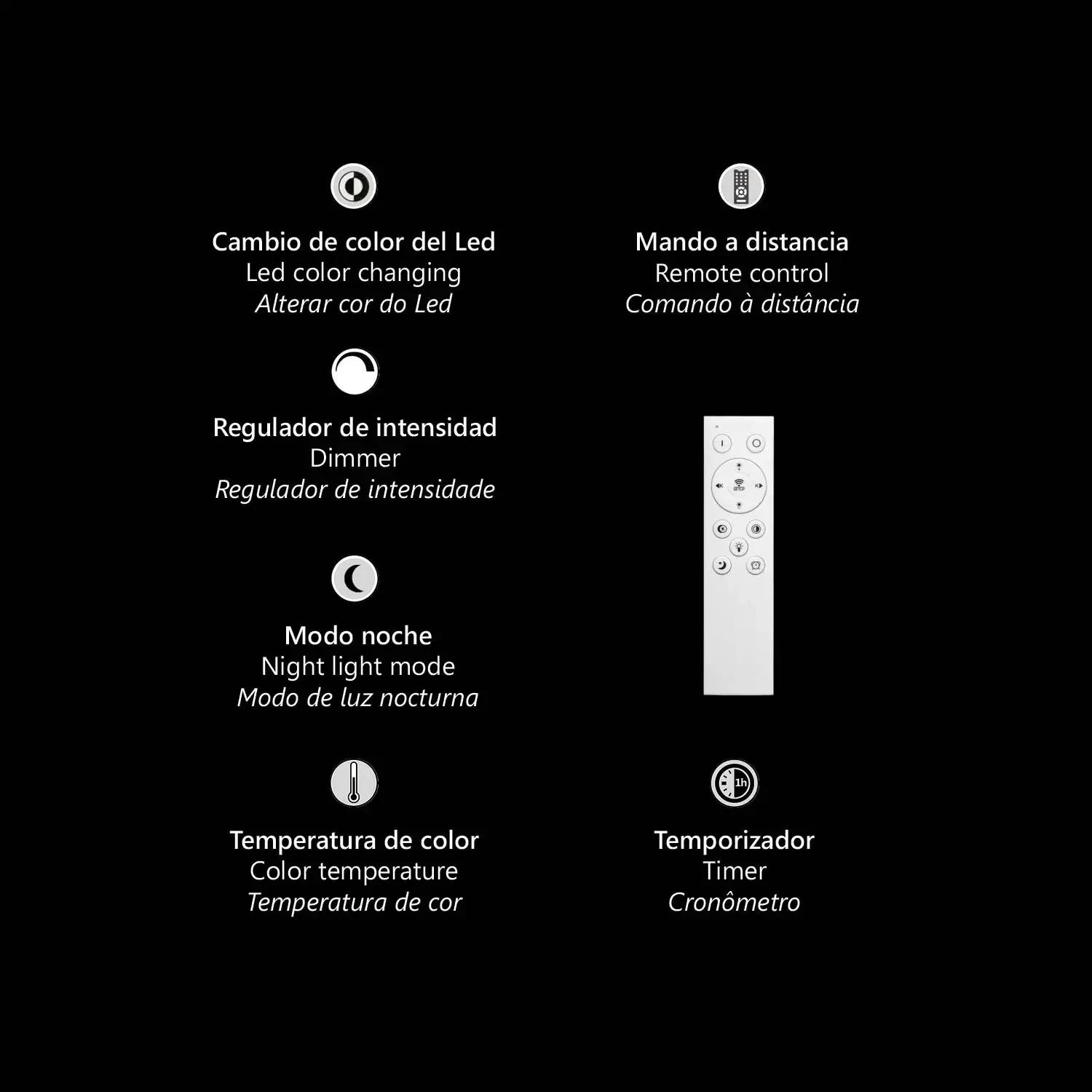- Fonctions avancées : variateur d’intensité, minuterie, mode nuit et télécommande incluse.